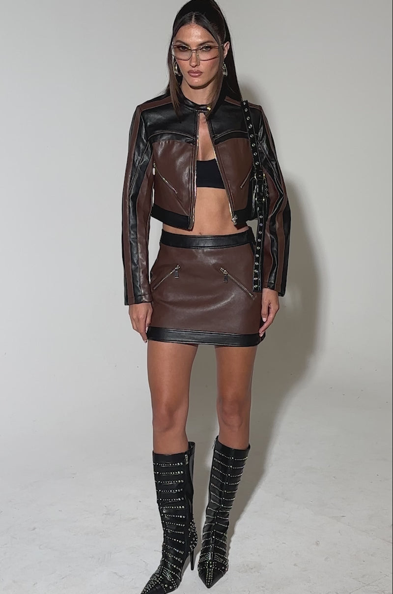 You were built for attention in The AKIRA Label No Pictures Please Cropped Moto. Crafted from sleek faux leather, this biker-inspired jacket features a striking two-tone design enhanced by sleek vertical sleeve stripes for a streamlined silhouette, a standing collar with snap-button closures, long sleeves, silver-tone hardware, angled waist zip pockets, and a front zip closure. Complete with a boxy, cropped fit. Pair with the matching AKIRA Label No Pictures Please Mini Skirt, platform loafers, and frilly ankle socks for a finished look.