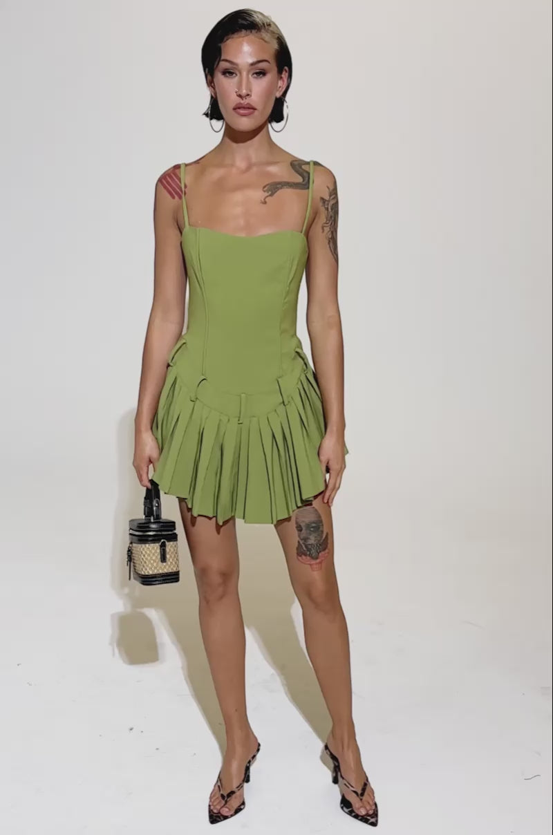 Twirl into the spotlight with the Dancing Through Life Mini Dress in Olive. This casual-chic mini dress features a structured corset-style bodice with adjustable straps for a flattering fit. The flirty pleated skirt adds playful movement, while the olive hue keeps it chic and versatile. It’s complete with smooth interior lining, a tonal zipper back closure, and functional belt loops. Pair it with heels and a mini bag for a picture-perfect look.