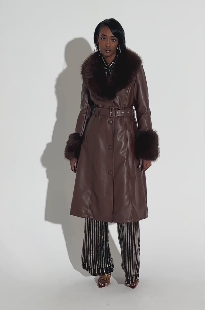 Level up your sophistication with The AKIRA Label Kaya Fur Lined Trench In Brown. This chic style is crafted from a faux leather base and features a luxurious fold over faux fur collar, long sleeves with matching fur cuffs, functional belt loops with a tonal waist belt, side slant pockets, and a super cozy sherpa inner lining. Complete with vertical seam stitching, tonal button down front closures, and a longline silhouette. Pair with a sweater dress and knee-high stiletto booties for a finished look.