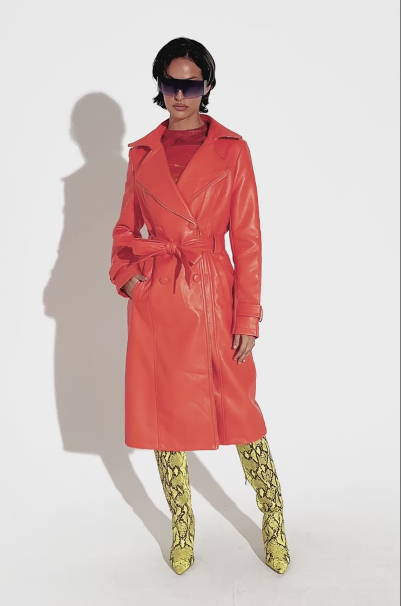 She’s a femme fatale! The AKIRA Label Sando Zipper Trim Trench in Orange is a sleek, mid-length jacket crafted from soft, supple faux leather. It features a classic trench coat silhouette with a double-breasted button front closure, a waist-cinching, self-tie belt, deep side slant pockets, long sleeves with decorative straps at the wrist, slick inner lining, and a wide notch lapel collar with decorative metallic zipper trim.