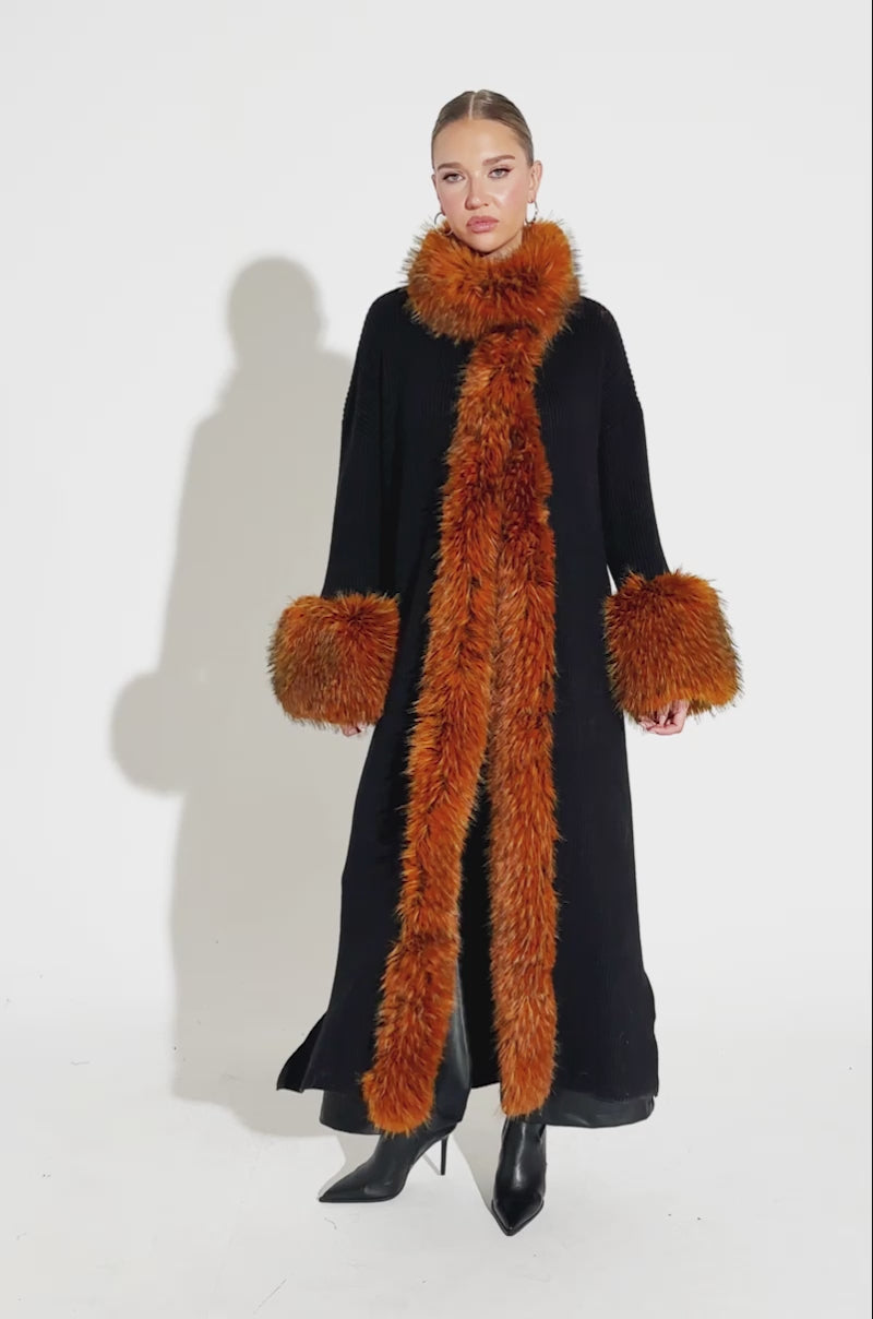 Forget being quiet — luxuriate loudly in The AKIRA Label Snowy Night Long Cardigan in Black. This fabulous full-length sweater is crafted from an incredibly soft, stretchy fisherman knit fabrication and features an open-front, split-seam design, an impossibly plush faux fur collar, coordinating faux fur trim throughout, long sleeves with faux fur cuffs, and spacious side seam pockets. Style with slim black bottoms and a stiletto boot for a glamorous winter look.