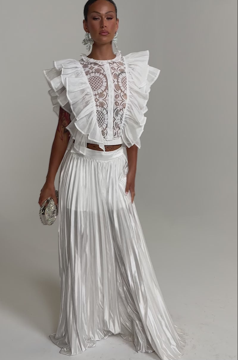 Ruffled white lace blouse perfect for spring styling and sweet brunch looks. Crafted from a lightweight, airy white material, this top features a mock, ruffled neckline with a button closure, a sheer, sleeveless lace base, an elasticized hem, and tiered ruffled accents at the shoulders for dramatic volume and added visual appeal. Style with a denim mini skirt and brown leather knee high boots for a feminine spring look.