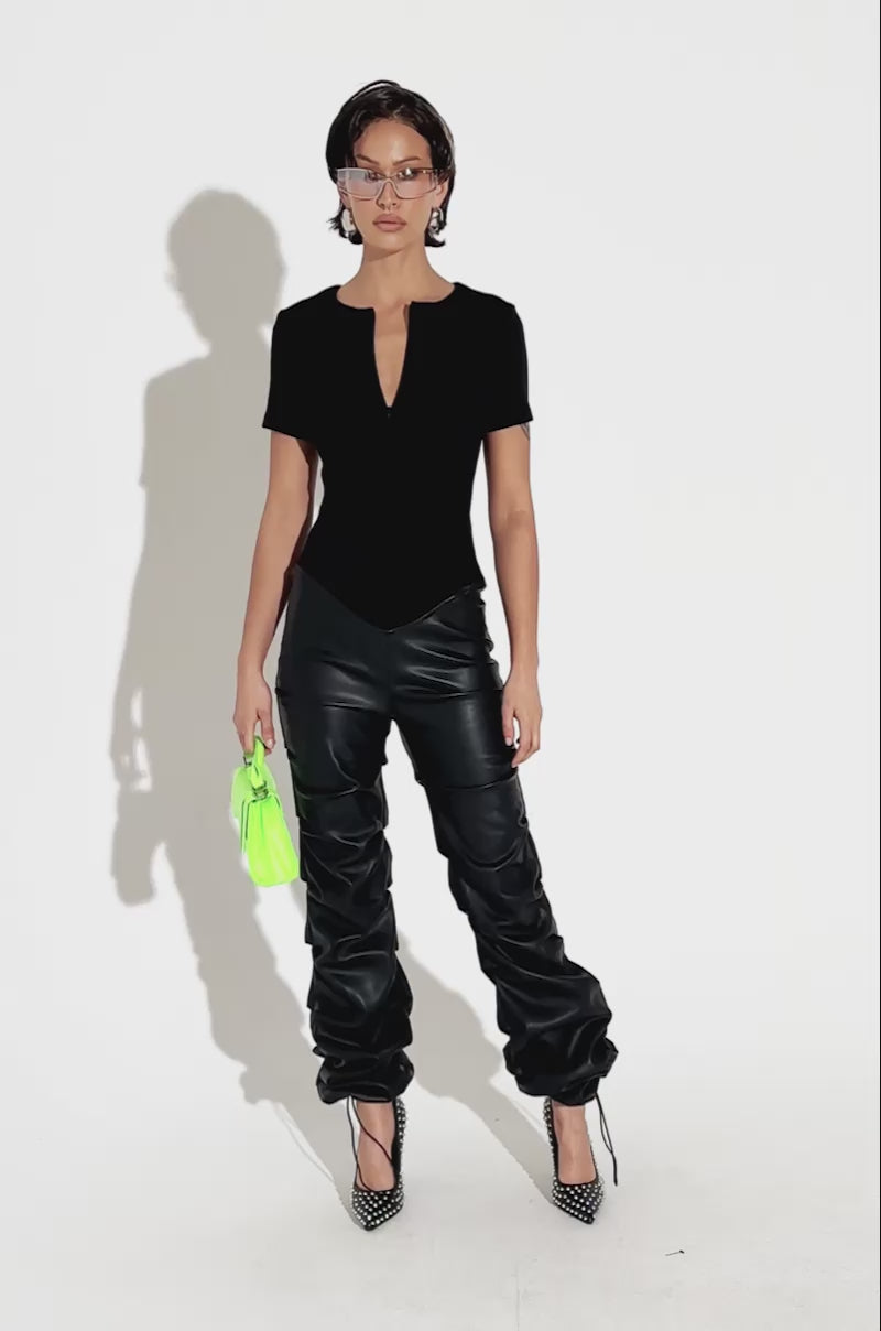 Sleek nā sexy in The AKIRA Label Charli Stacked PU Jumpsuit In Black. This cool-girl piece boasts an upper half crafted from a sleek knit bae with a crew neckline, short sleeves, a front zipper closure, and underbust seaming. The midriff features a stretchy, curve-snatching elasticized waistband that leads into attached, tonal faux leather pants that show off a ruched construction, and elastic pant cuffs with bungee cord closures for a cinched look. Complete with a concealed back zipper closure, and a straight leg silhouette. Pair with stiletto pumps and a red lip for a sultry finish.