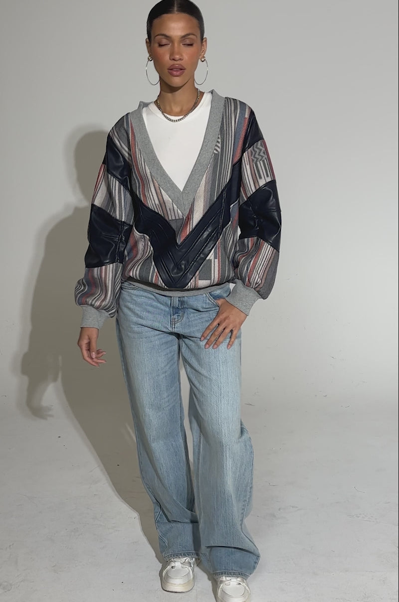 The AKIRA Label Into The Wild Deep V Sweatshirt is a statement pullover that fuses Southwestern textile design with modern streetwear appeal. Made from a soft, brushed knit base, this sweatshirt features multicolor vertical and chevron stripes in tones of charcoal, clay, cream, and navy. The deep V-neckline is framed in wide ribbed knit trim for contrast and structure, creating a bold focal point. Black faux leather inserts form a pointed chevron across the chest and upper sleeves, adding edge and dimension. Finished with balloon-style sleeves, ribbed cuffs, and a wide hem for a relaxed yet cinched fit, this piece pairs best with high-waisted denim or layered over a bodysuit.