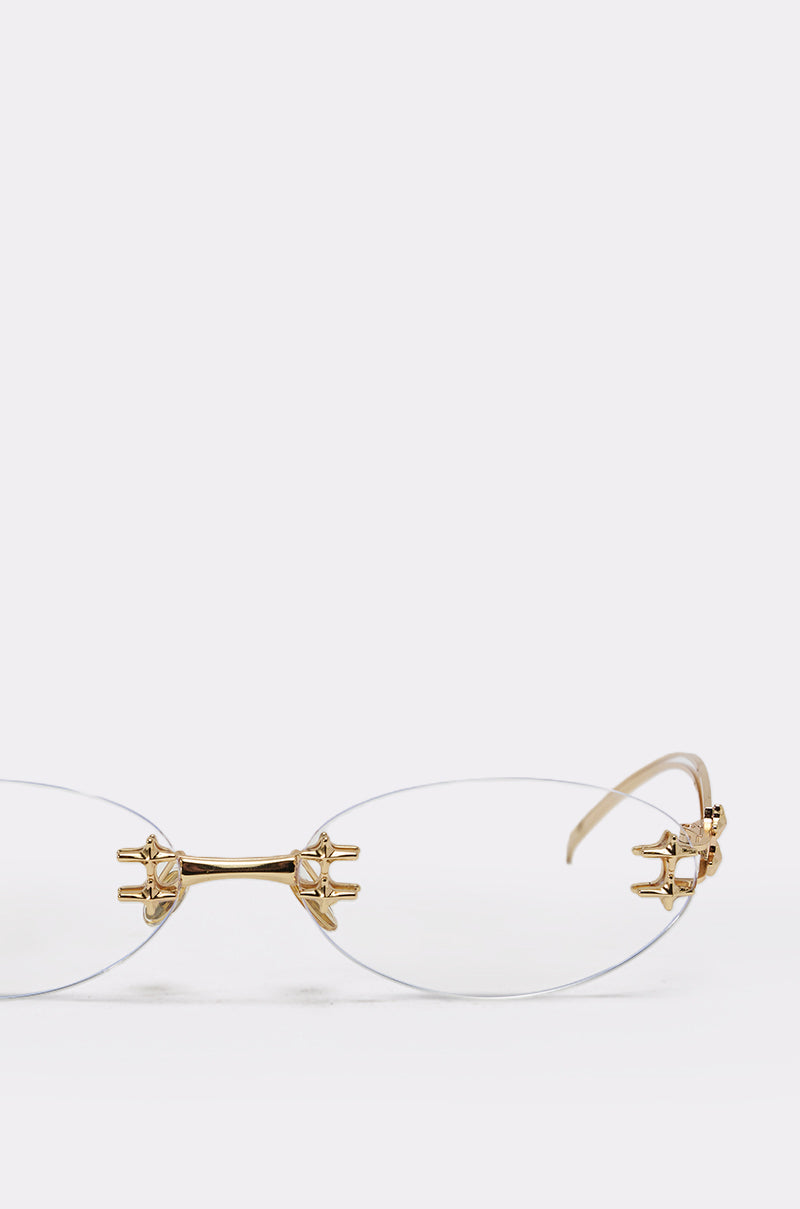 These on-style rimless oval sunglasses feature a lightweight gold-tone metal frame with barely-there clear lenses for an elevated, minimalist vibe. Complete with slim, curved temple arms and delicate star-shaped accents along the temples and adjustable nose pads for comfort, these statement shades elevate any going-out ensemble.