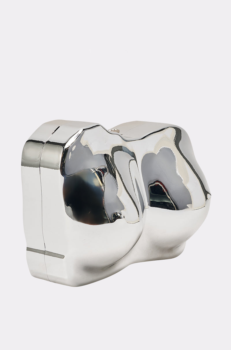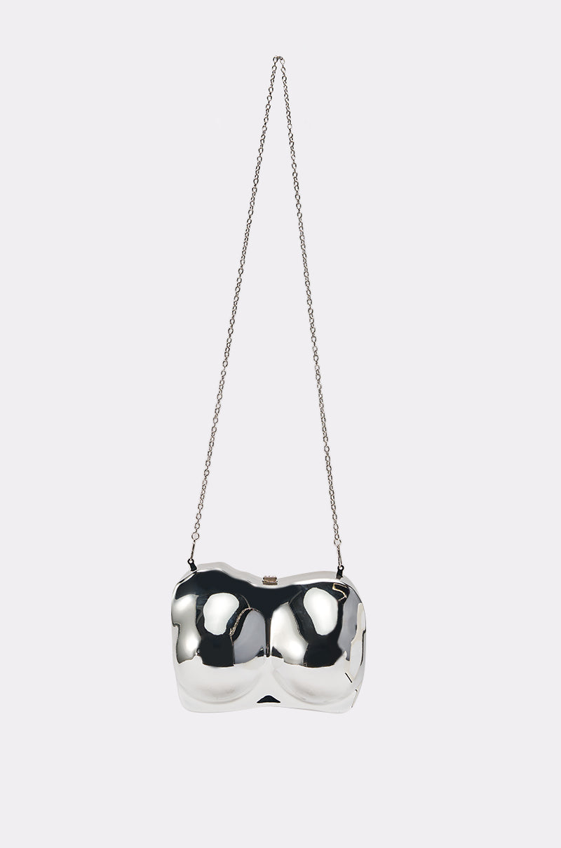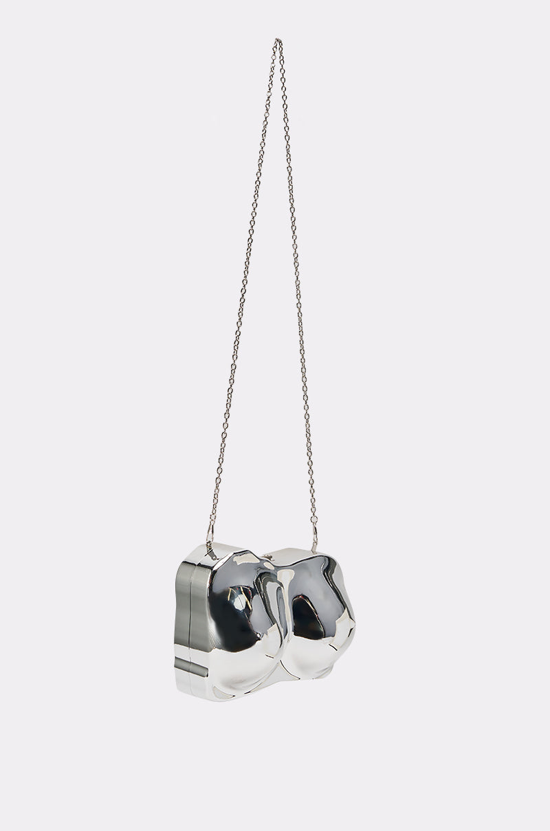 The bigger the better. The AKIRA Label A Bit Busty Clutch is crafted from a high-shine, silver metallic base and features a structured, bust-shaped silhouette with a flat base, a rhinestone-embellished snap-top closure, and a removable silver chain link strap for an optional crossbody fit.