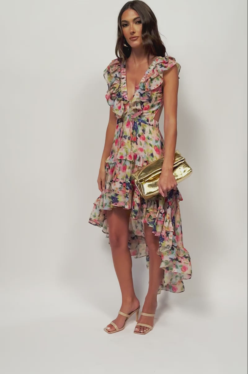 The AKIRA Label A Work Of Art Printed High Low Mini Dress is made from a colorful, non-stretch chiffon fabrication and features a vintage-inspired floral print, a plunging neckline with shirred elastic trim, short ruffled sleeves, coordinating ruffles down the chest, ruched detailing under the bust, a cinched elastic waistband, and a strappy open back silhouette. Complete with an attached inner slip, a mini length design with tiered ruffle detailing along the skirt, a romantic high low hemline, a pull-on fit, and adjustable tie-back straps.