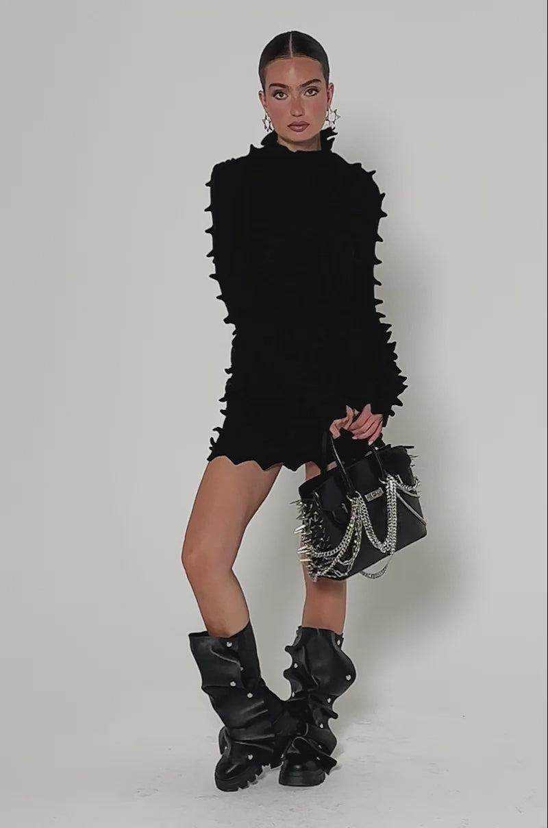 Beauty is in the eye of the beholder. The AKIRA Label Abstract Art Textured Knit Long Sleeve Top is an elevated interpretation of a classically cool black turtleneck. Crafted from a soft, super stretchy knit fabrication, this sweater features a turtle neckline, full-length sleeves, and an abstract, pointed design throughout. Style it with the complementary Abstract Art Textured Knit Mini Skirt, a beret, and knee-high boots for an effortlessly artistic ensemble.