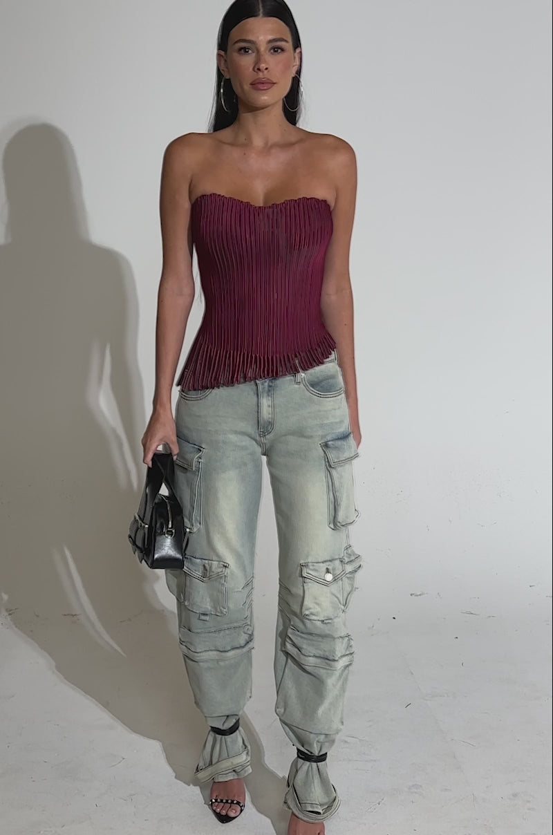 The AKIRA Label Accordion Corset Top in Burgundy is crafted from a sheer, stretchy mesh base with a satiny, accordion-pleated overlay that adds eye-catching texture and dimension. It also features a cropped fit, subtle sweetheart neckline, an asymmetrical hemline, and a back zipper closure. Style with wide-leg trousers and strappy stilettos for a polished finish.