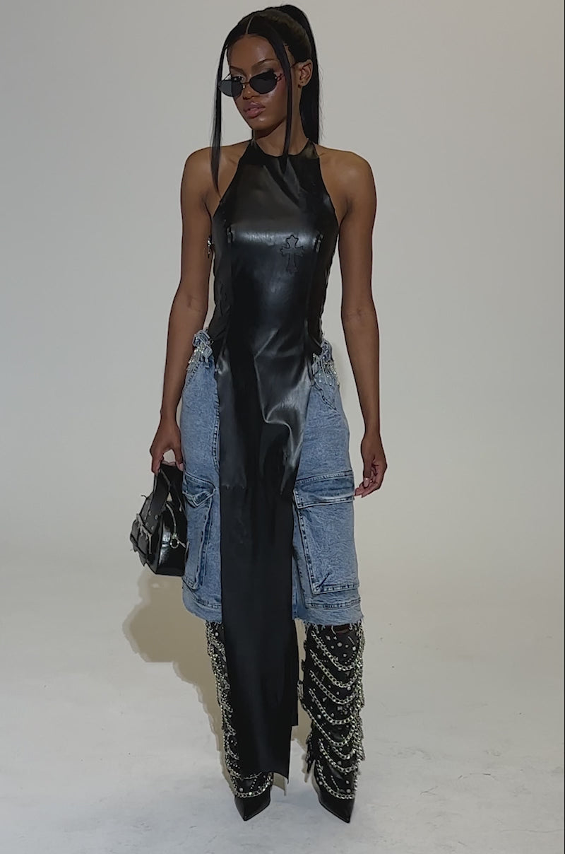 The AKIRA Label Addie Faux Leather Blouse is an avant-garde statement piece designed to blend edge with precision tailoring. Constructed from supple faux leather, it features sculpted cross appliqués embossed across the front bodice that add dimension and subtle detail without overpowering the streamlined silhouette. The halter neckline meets a fitted bodice that extends into a dramatically elongated panel, creating a coat-tail illusion that adds high-fashion drama. The back is trimmed with a precise row of silver dome studs, emphasizing the corset-style fit, while a side zipper closure offers functionality without disrupting the seamless flow of the design.