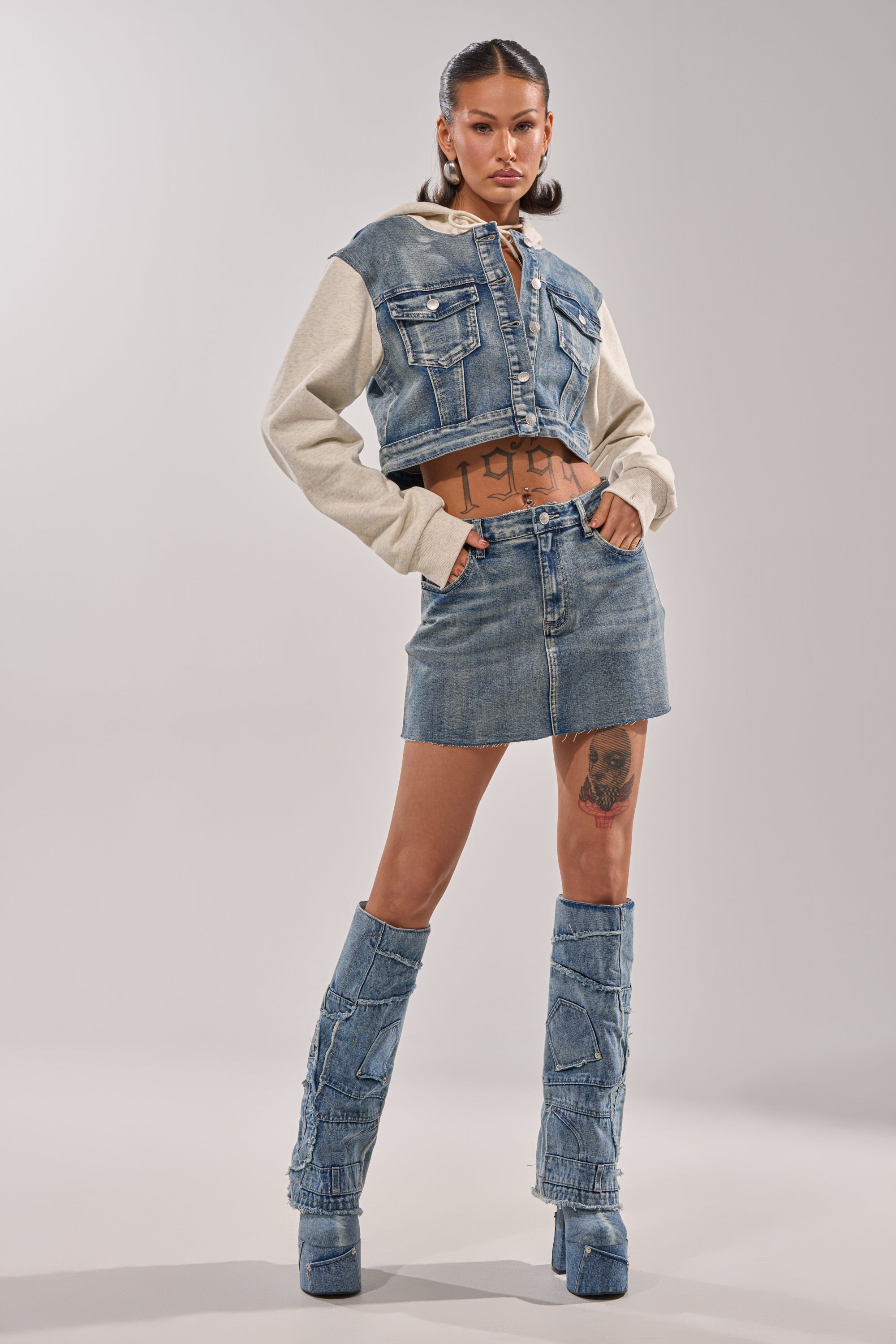This cropped denim jacket is the ultimate transitional layer featuring a cool mixed-media design, a roomy fleece drawstring hood, matching long fleece sleeves with elasticized cuffs, a classic button-front closure, chest flap pockets, silver-tone hardware, and a cropped cut. Style it with the coordinating AKIRA Label After Hours Mini Skirt, moto boots, and a shoulder bag for an effortless day-to-night finish.