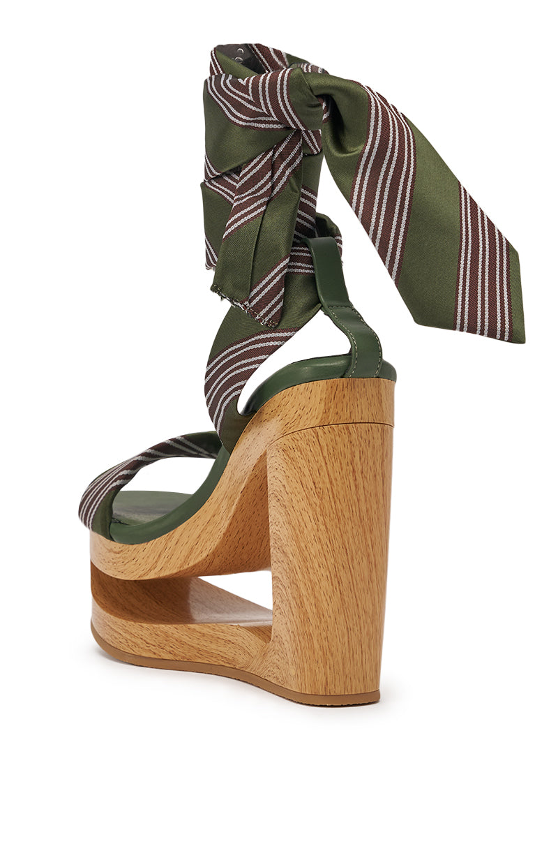 Bold bow-detail tie wedge sandal with a luxe, runway-inspired feel, perfect for dinner plans, rooftop parties, or making a statement on vacation. Featuring a sculptural wood-look platform wedge with a sleek open almond-toe design, this sandal levels up your look with a rich olive business-tie style upper with chic striped contrast detailing. Designed with a wide front strap, Comfort Cushion insole, and an oversized wraparound ankle tie that can be styled into a dramatic bow, it serves elevated drama with every step. Pair it with a fitted midi dress for a polished moment.