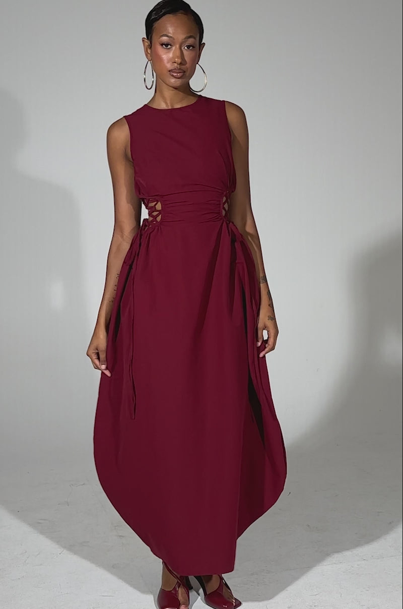 ALINA LACE UP DETAIL MAXI DRESS IN BURGUNDY