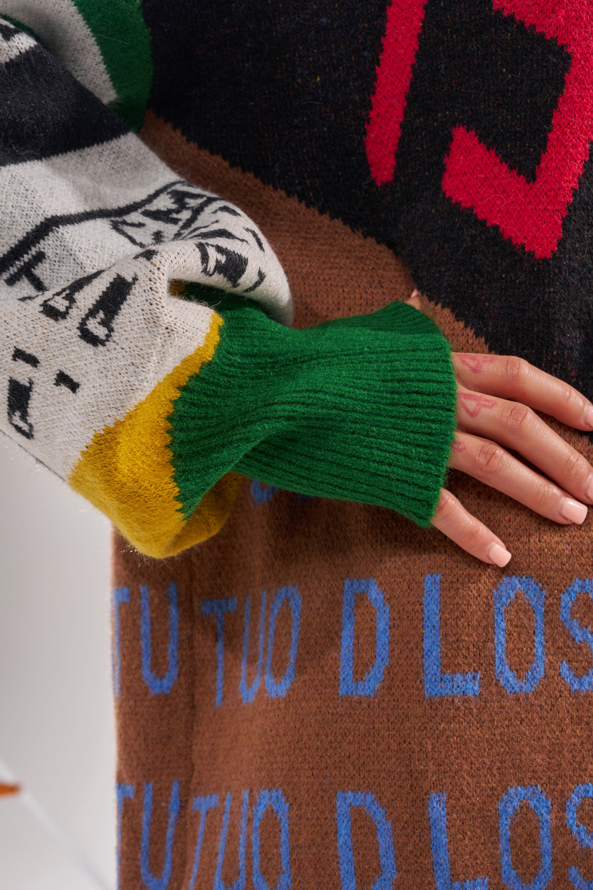 The AKIRA Label Alpha Hooded Sweatshirt Dress in Yellow Multi features a bold, streetwear-inspired style with its oversized hooded silhouette with adjustable ties, mixed graphic text elements, and vibrant patchwork design in mustard, black, green, and white tones. Crafted from a soft knit fabric, it features long sleeves with contrasting bands, a relaxed fit that drapes effortlessly, and a mini-length hem that adds a flirty, modern edge. Pair with a black knee high boot for the perfect comfy chic look.