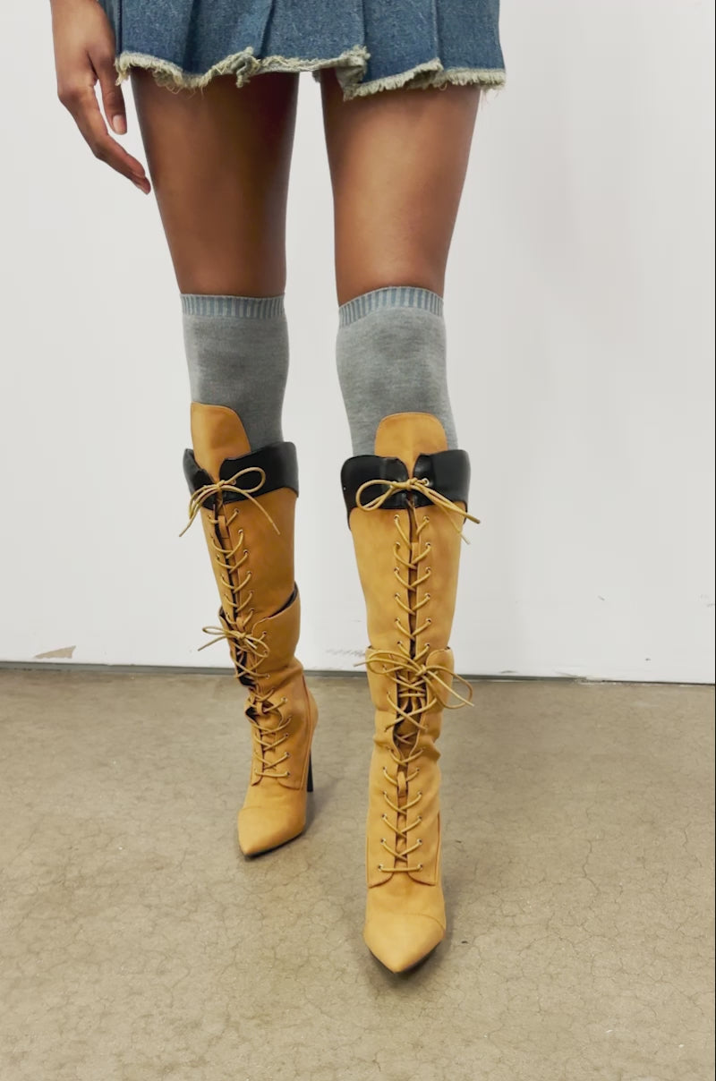 Strut into boot season in the Annamarie Brown Stiletto Boot. Crafted from a supple faux leather upper, these knee-high boots feature a sexy pointed toe, a slim, sky-high stiletto heel, a lace-up front vamp, dark faux leather trim, and a pull-on fit. Style them with an oversized faux fur coat and a mini skirt for the perfect going-out look.