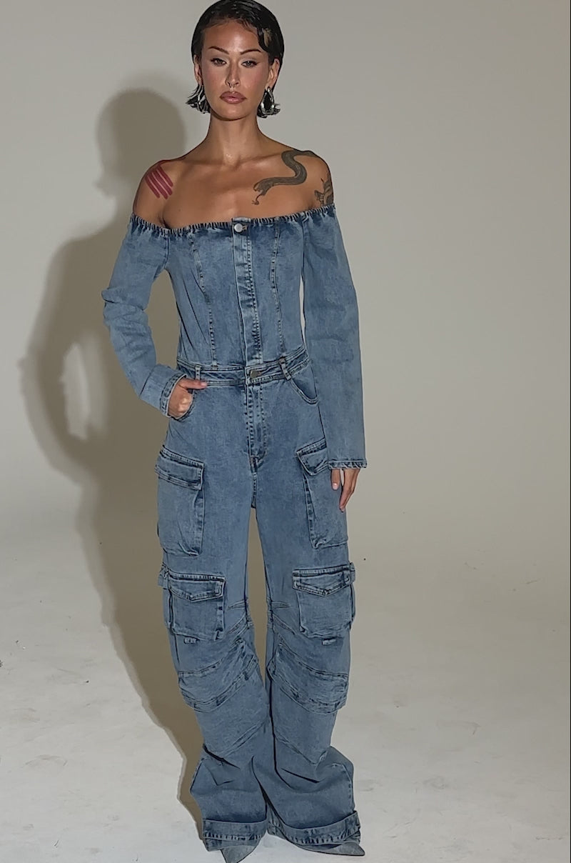 ARI LONG SLEEVE CARGO DENIM JUMPSUIT