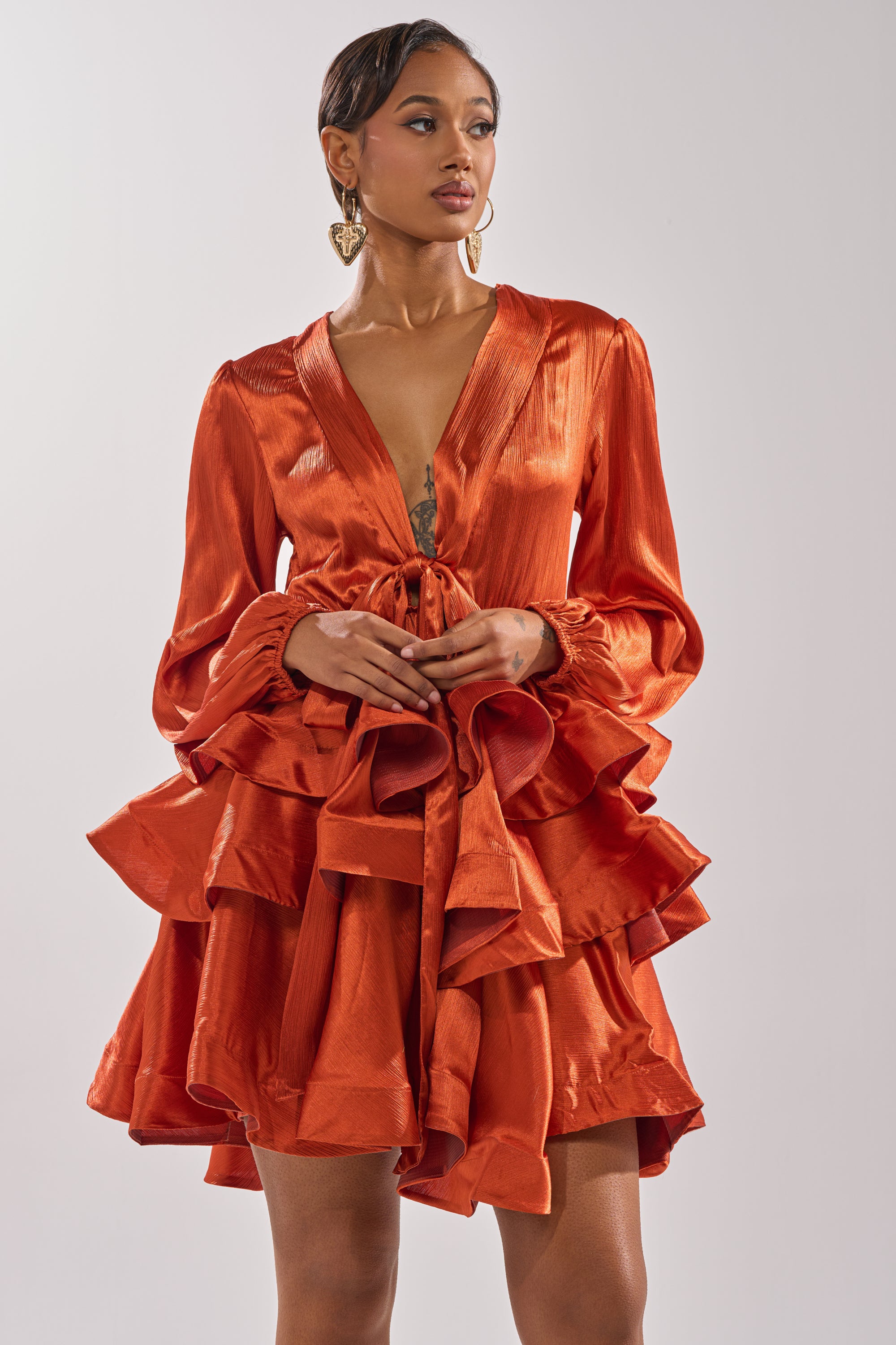 Oh so chic! The AKIRA Label Ariana Satin Ruffled Mini Dress is crafted from a lustrous, satin fabric in a rich, burnt orange colorway. It features a deep V-neckline that leads into an adjustable front tie closure, long sleeves with elasticized cuffs, a cinched waist, and dramatic tiered ruffles that cascade into a voluminous flared skirt. Pair with strappy stilettos and a clutch, perfect for special occasions or elevated evening wear.
