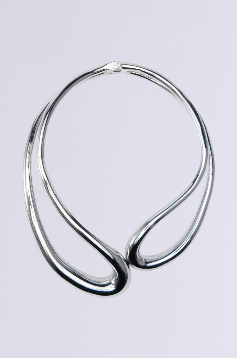 Look like a living, breathing art installation in The AKIRA Label Ash Abstract Necklace. This sturdy statement necklace is crafted from a metallic faux silver base and features a close-fitting, choker-like design, a uniquely welded, abstractly asymmetrical silhouette, and a hinged back for easy application and removal.