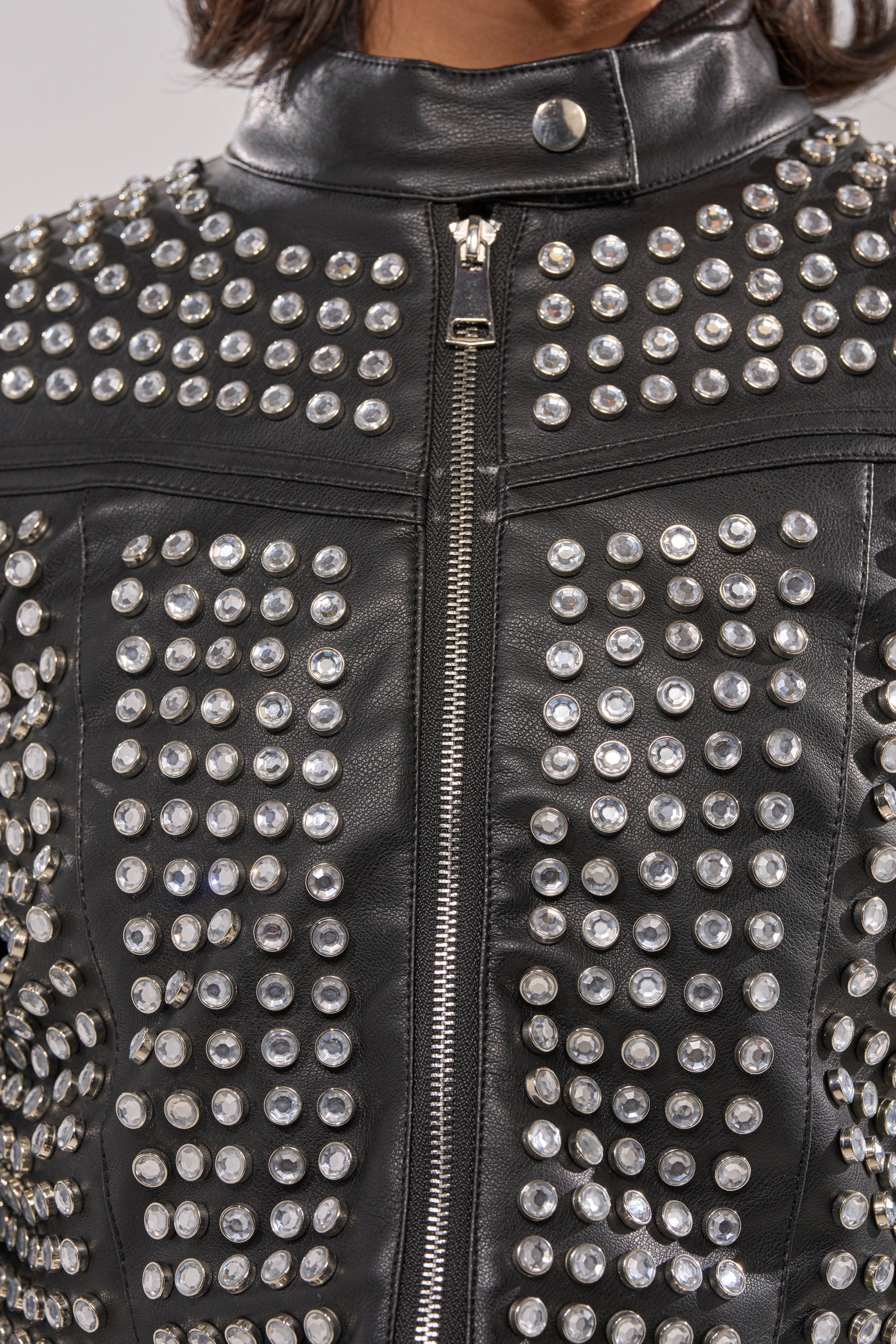 This glamorous faux leather moto jacket in a sleek black colorway brings all the drama with an allover bedazzled stud design and a chic cropped length that hits right at the waist. Featuring a structured standing collar with a snap-tab closure, a full front zipper closure, and long sleeves finished with edgy zip cuffs for that extra hit of attitude. Style it with a slinky satin slip dress or a fitted bodysuit and high-rise denim for a night-out look that doesn’t play it safe.