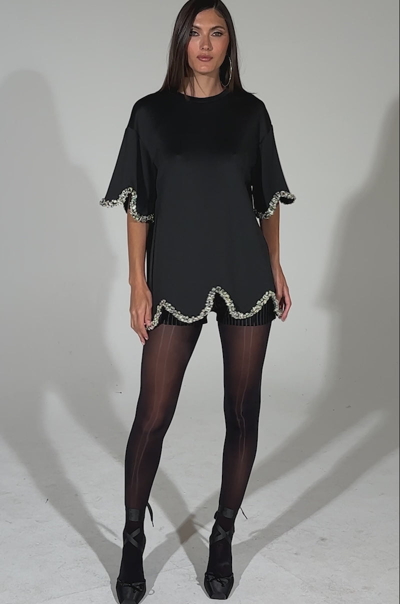 Seize the day in The AKIRA Label At Least I’m Alive Oversized Tee With Rhinestone. Crafted from sleek, stretchy fabric, this glitzy top features scalloped hemlines lined with dazzling rhinestone trim, a rounded neckline, a drop-shoulder design, short sleeves, and a pull-on fit. Complete with an oversized silhouette. Pair with biker shorts, knee-high boots, and oversized sunnies for a streetwear-meets-luxury vibe.