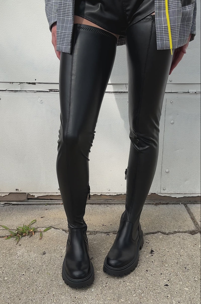 In the mood for noir? The AZALEA WANG Ajuna Black Flat Thigh High Stretch PU Boot is made from buttery, stretchy faux leather and features an almond toe, a rugged lug sole, a coordinating chunky heel, and an inner ankle zip closure.