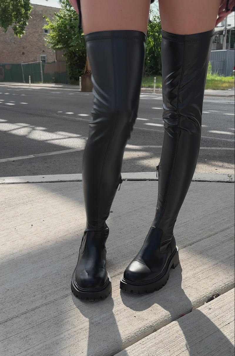 Boot up, baby! The AZALEA WANG Alinafe Black Over The Knee Stretch PU Boot is crafted from semi-stretchy, sleek faux leather and boasts an almond toe, a rugged lug sole, a coordinating chunky heel, and a sultry over-the-knee shaft. Complete with an inner ankle zip closure.