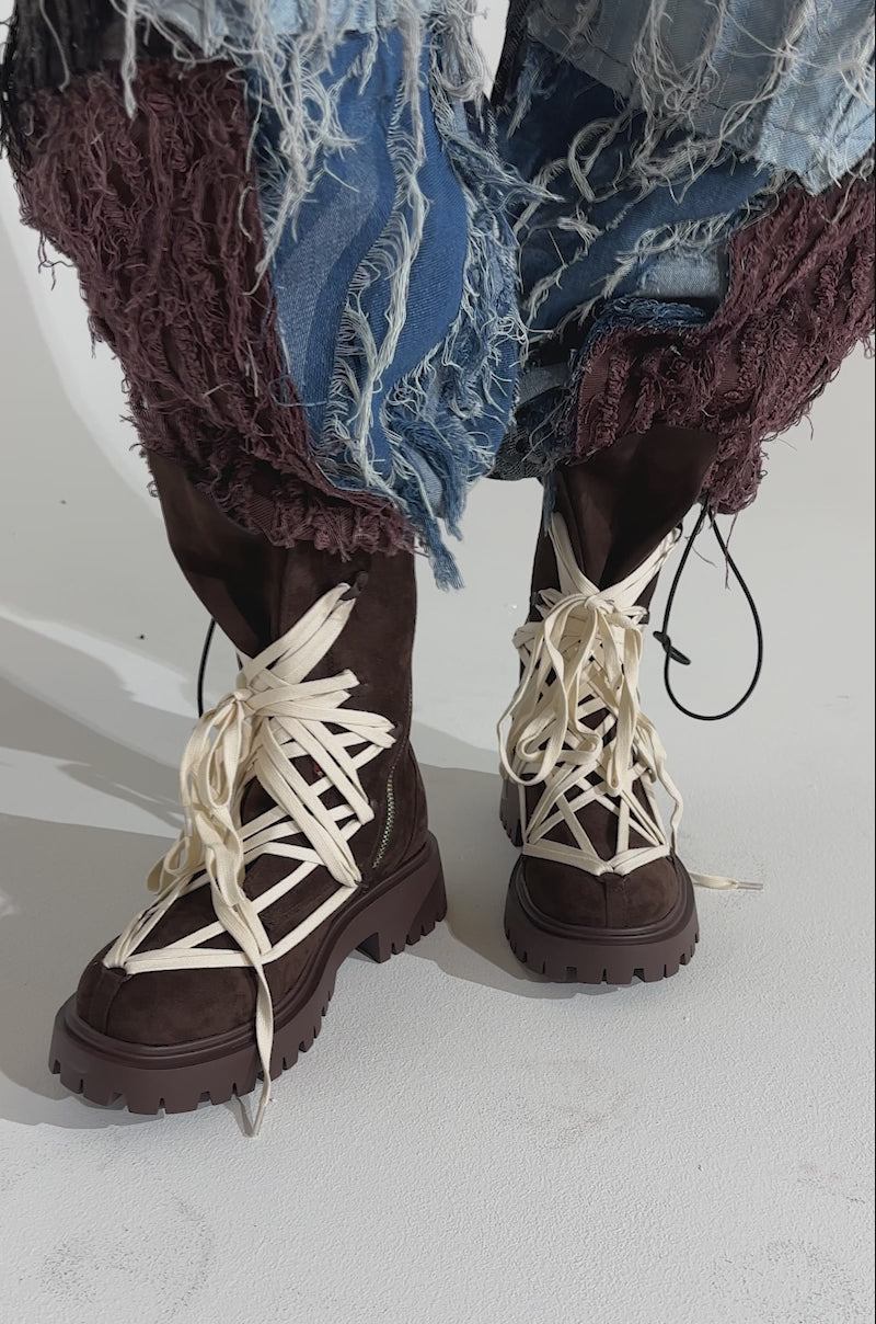 Look ultra-smooth in the AZALEA WANG Arjun Chocolate Lace Bootie. Crafted from velvety smooth faux suede, this combat-style bootie features an almond toe silhouette, a durable ridged lug sole, a coordinating chunky heel, and cream lace-up detailing that crisscrosses dramatically over the front of the shaft. Complete with an extended tongue, a back pull tab, and an off-center metallic side zipper closure. These versatile cuties pair effortlessly with cargo pants, maxi skirts, or cargo ensembles.