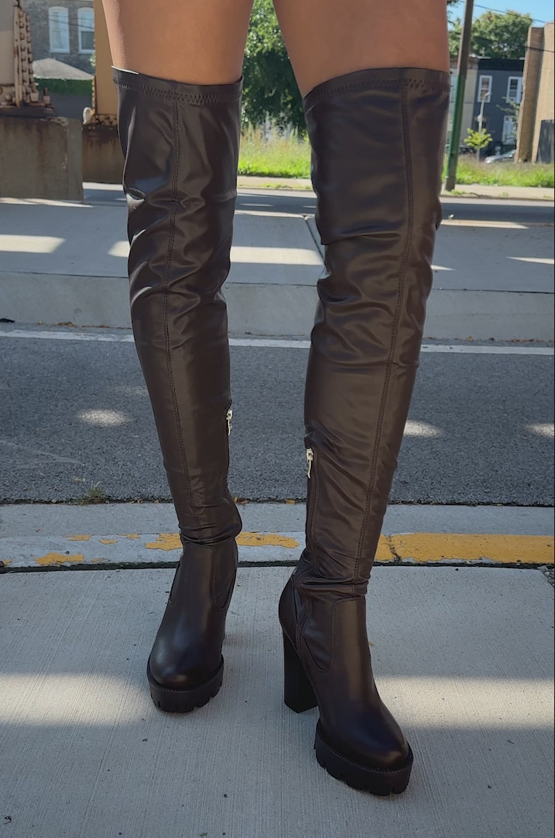 AZALEA WANG ASHLAND CHOCOLATE STRETCH PU CHUNKY THIGH-HIGH BOOT