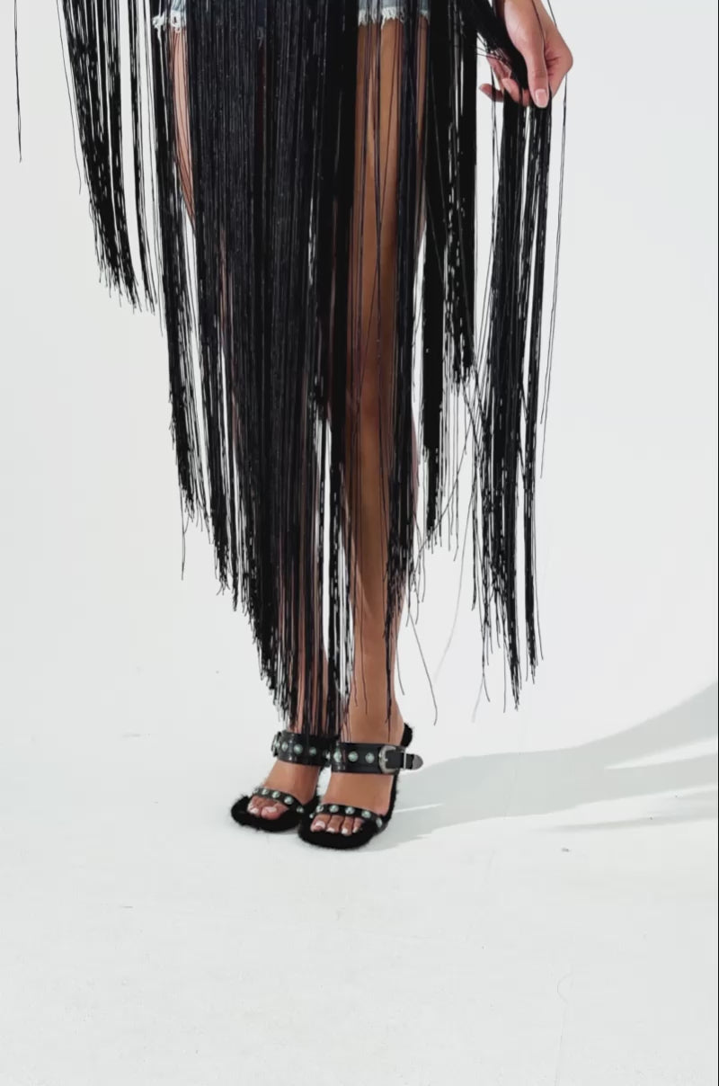 Oh, hi sexy! The AZALEA WANG Auger Black Sandal is crafted from a luxe vegan leather and boasts an open square toe silhouette, a slim stiletto heel, a tonal leather Comfort Cushion insole lined with a tonal faux fur, a thick toe band that features blue gemstone detailing with embossed silver metallic trim, and a coordinating gemstone-adorned footband with a western-inspired strappy belt accent. Complete with a rubber outsole, and an effortless, slide-on design. Pair with a tassel skirt and a corset for a fab finish.