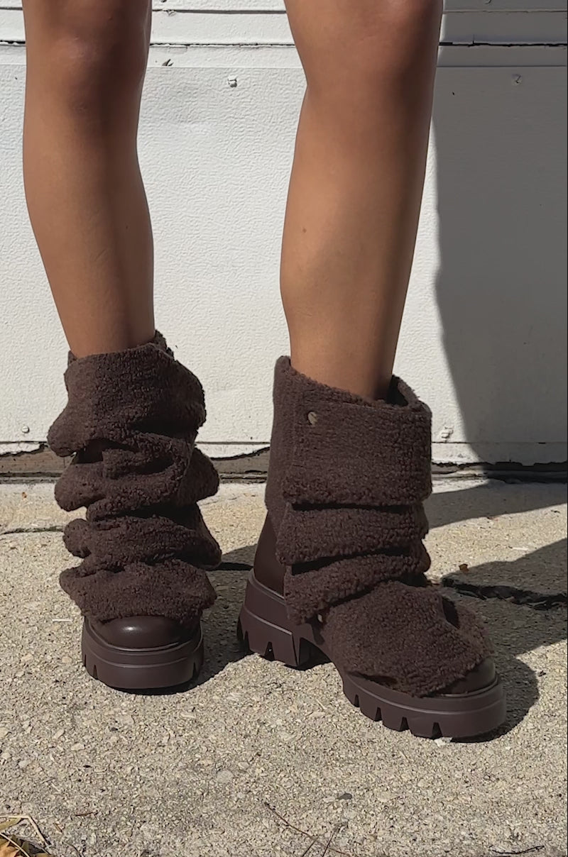 Made to roam in the AZALEA WANG Behati Brown Sherpa Bootie With Snap Detail. This versatile cutie features a cozy faux sherpa upper with tonal faux leather detailing on the toe and back of the ankle, a ruched mid-calf shaft with silver-tone snap button detailing, an almond toe, a durable lug sole, and a coordinating chunky heel. Complete with an effortless, pull-on fit.