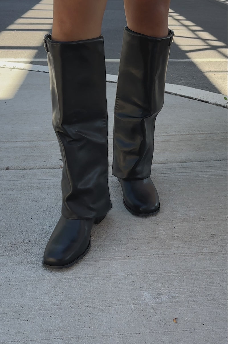 Kick up the drama in the AZALEA WANG Bronte Black Flat Knee High Riding Boot. Crafted from supple faux leather, these sleek knee-high boots feature a rounded square toe, a short chunky heel, a fold over shaft, and a silver-tone buckle detail at the shaft opening. Complete with a pull-on fit.