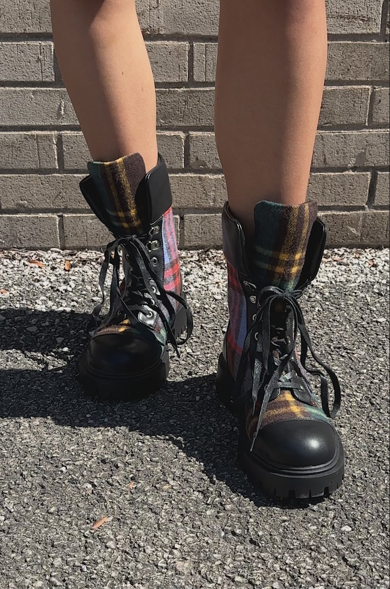 AZALEA WANG CALIBAN BLACK MULTI PLAID COMBAT BOOTIE