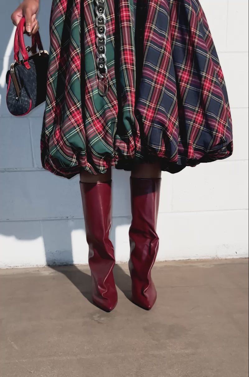 Step out in confidence in The AZALEA WANG Couture Crazy Burgundy Boot. This sexy knee-high style is crafted from smooth faux leather and features a uniquely sculpted, slouchy silhouette, a pointed toe, a slim, rounded stiletto heel, and an easy pull-on fit. Style with baggy denim, a graphic baby tee, and a cropped moto jacket for a finished look!