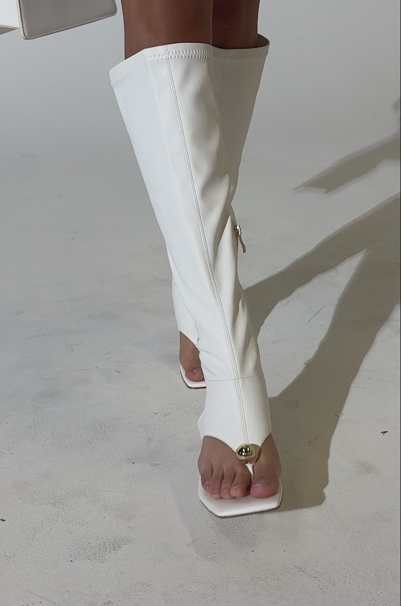 Feelin’ bubbly? The AZALEA WANG Dippin Dot White Stretch Sandal Boot flawlessly blends structure and softness. Made with creamy, stretchy faux leather, this knee-high sandal boot features an open square-toe silhouette, a thong strap ornamented with a metallic gold-tone orb, and coordinating, sculptural gold orb heels that add height and futuristic flair. Complete with a Comfort Cushion insole and an inner-ankle zipper closure. A bold choice for editorial styling, trend-forward fits, or fashion week looks.