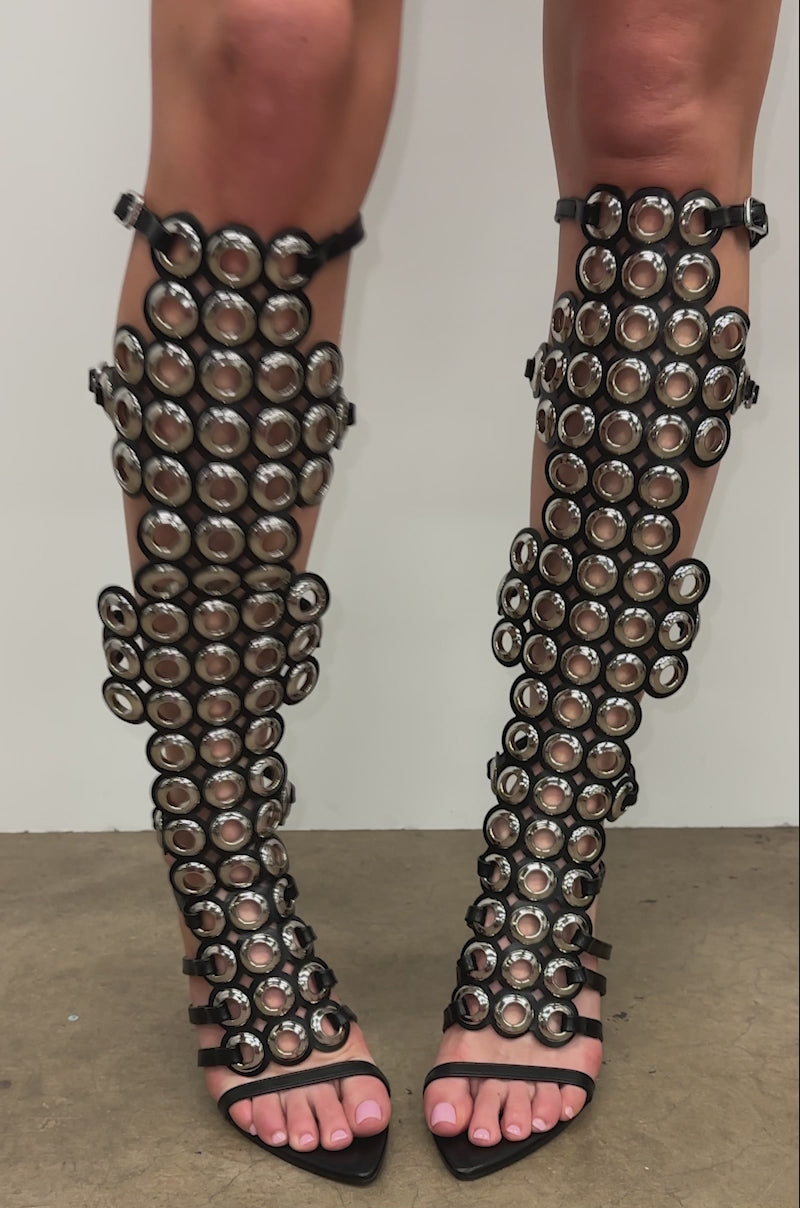 The AZALEA WANG Ellinor Black Grommet Detail Gladiator Sandal is a bold knee-high stiletto that makes a statement. Designed with sleek, adjustable straps, the standout feature is its full-length front panel covered in oversized silver grommet accents, adding shine and edge. The pointed open-toe silhouette balances the dramatic look, while the tall heel brings leg-lengthening height. Complete with a back zipper closure and a Comfort Cushion insole.