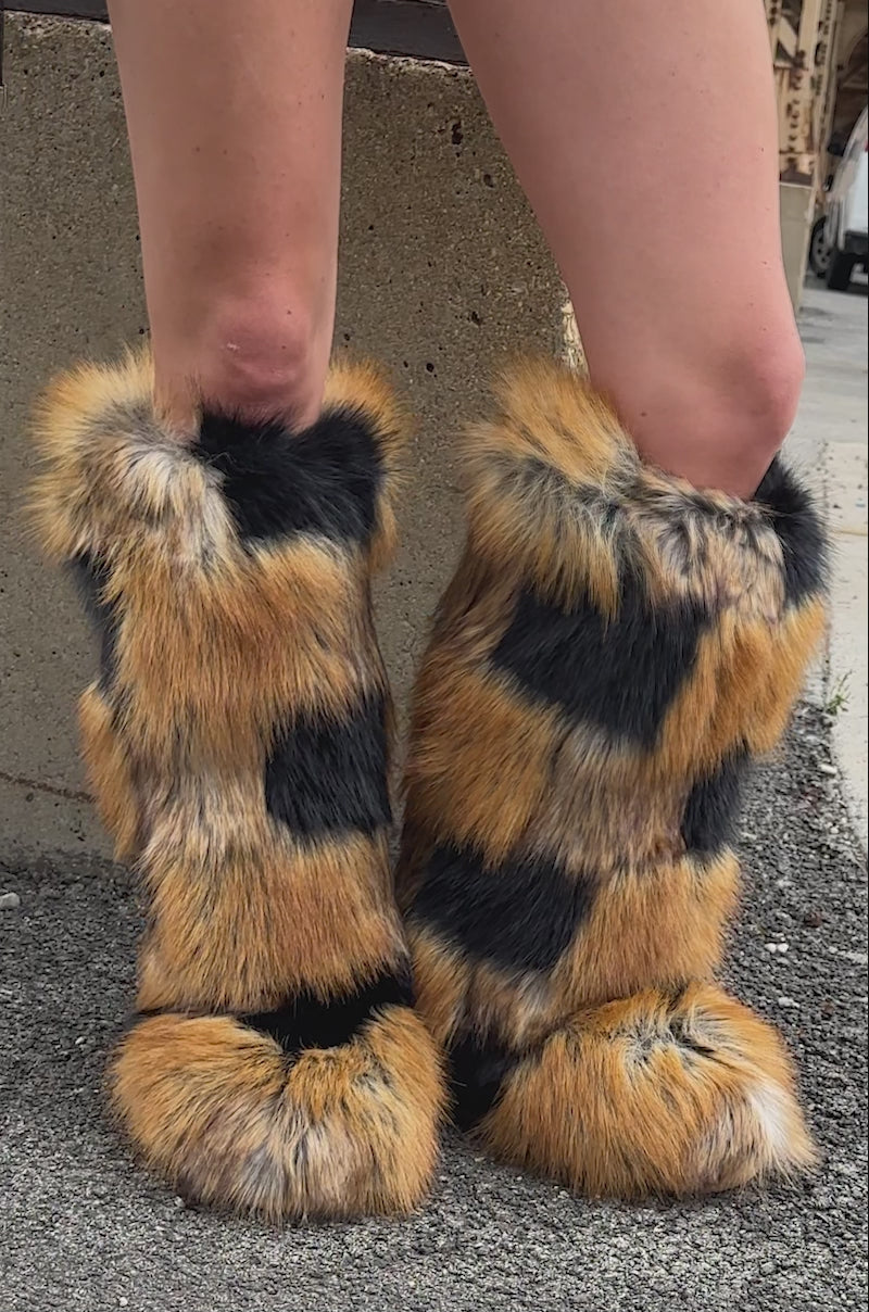 Fall footwear is sooo back. The AZALEA WANG Fennec Multi Patchwork Fur Knee-High Boot is designed with an ultra-plush patchwork pattern of faux fur in warm brown, tan, and black tones. It features an oversized, knee-high silhouette, a round toe, a flat, textured rubber sole, and an effortless pull-on fit. Perfect for festival looks, night outings, or turning everyday wear into something unforgettable.