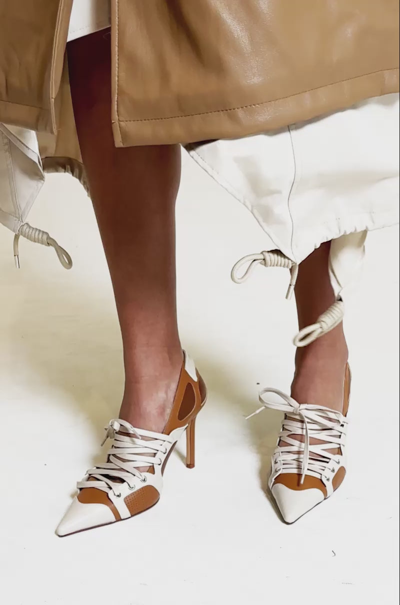 You’re guaranteed to be the fashion MVP in The AZALEA WANG First String Tan Color-Block Sporty Pump. Featuring a sleek pointed toe, perforated leather paneling, a Comfort Cushion insole, and contrast cream and caramel tones, these heels deliver a fresh take on athletic-inspired fashion. The sneaker-style lace-up front adds an edgy, unexpected twist to a classic high heel silhouette.