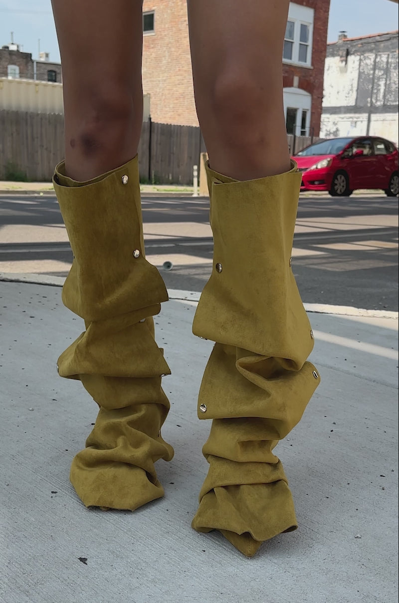 Crafted from soft, supple faux suede in an olive green hue, The AZALEA WANG Imogine Olive Folded Detail Stiletto Boot features an asymmetrical knee-high shaft, a pointed-toe silhouette, a flared stiletto heel, silver-tone hardware, and a back zipper closure. Complete with a tonal, scrunched front flap made adjustable by snap-button accents. Style with an oversized band tee and a leather tote for an effortlessly cool vibe.
