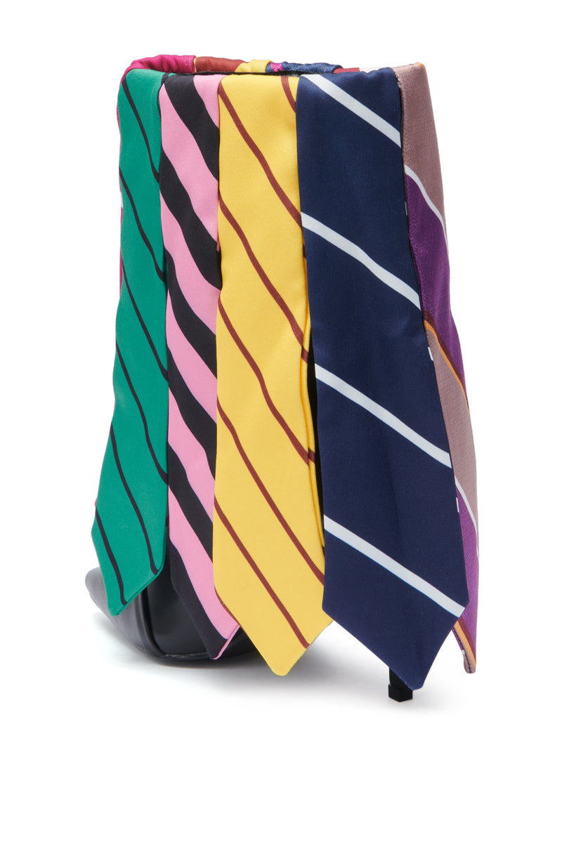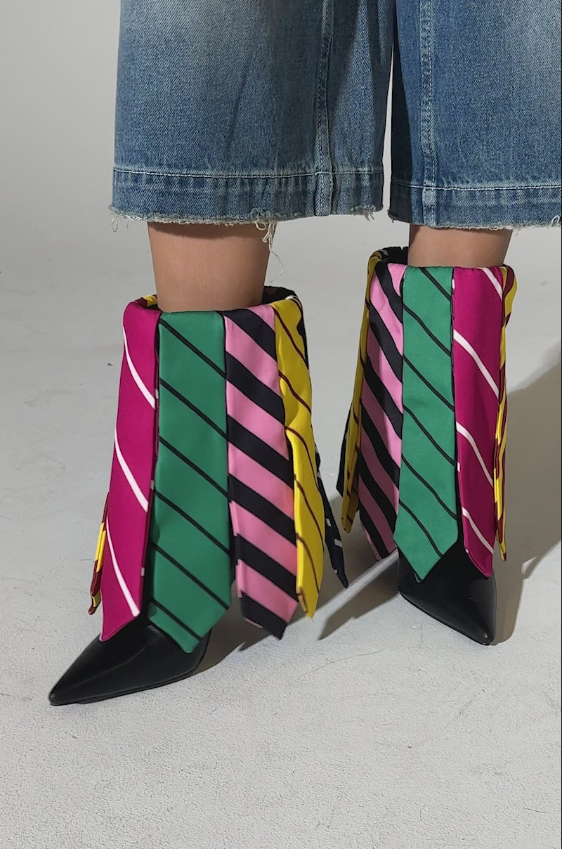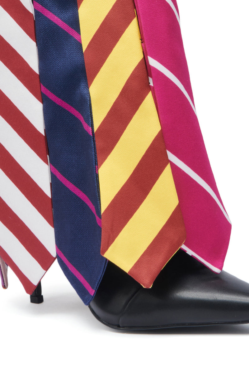 Redefine business casual with the AZALEA WANG Jaune Black Tie Bootie. This chic ankle boot is crafted from glossy faux leather and adorned with multi-colored, striped necktie-style appliques that dangle over the shaft. It features a pointed toe silhouette, a slim stiletto heel, and an effortless pull-on fit. Pair with anything from pencil skirts to trousers for a bold, one-of-a-kind menswear-inspired look