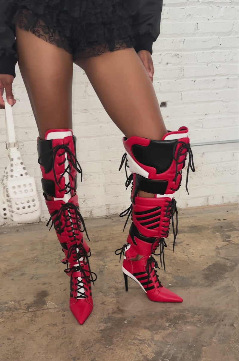 Shooters shoot — shooters score. Go ahead and shoot your shot in The AZALEA WANG Kaney Red Sport 2-1 Boot. Crafted from a faux leather upper, this unique 2-in-1 boot boasts a color block patterning with side striped patterning, a slim stiletto heel, a mid-calf shaft, front and back cut out detailing, lace-up paneling throughout, a velcro foot band strap, and a puffy top shaft. Complete with a coordinating, removable thigh piece that can transform the boot into a thigh-high silhouette. Style with basketball shorts and a crop top for a sporty chic ensemble. *Thigh piece does not connect to the boot itself.