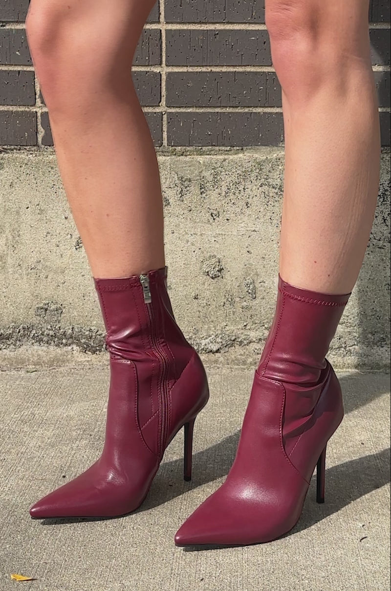 A new fall footwear staple just dropped. The AZALEA WANG Kathii Burgundy Bootie is a simple yet sexy style crafted from sleek faux leather in a rich burgundy hue. It features a sharply-pointed toe, a slim, sky-high stiletto heel, tonal stitching, and a stretchy shaft that hits just above the ankle. Complete with an inner-ankle zipper closure.