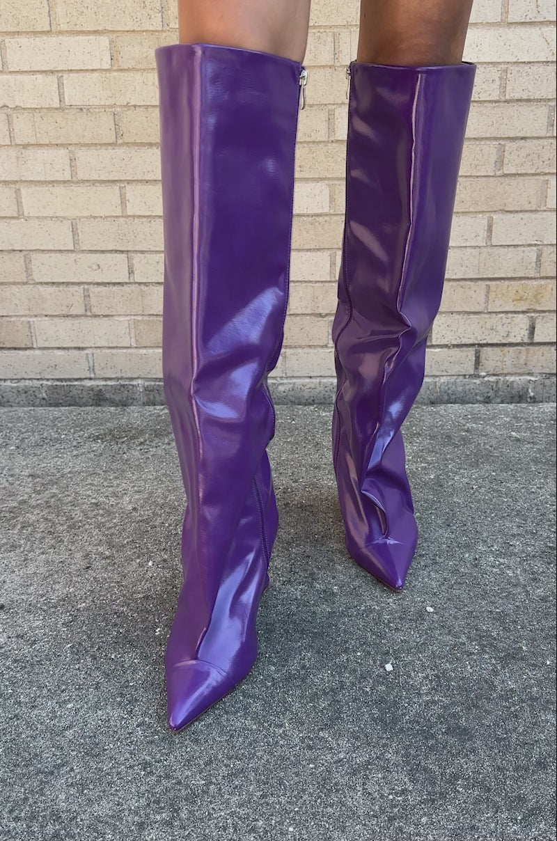 Purple reign. The AZALEA WANG Kenya Purple Knee-High Wedge Boot is crafted from glossy faux leather and features a wide knee-high shaft, a pointed toe, an angled wedge heel, and an inner ankle zip closure. Perfect for pairing with slim-fit jeans, mini dresses, or mini skirts to transition effortlessly from day to night.