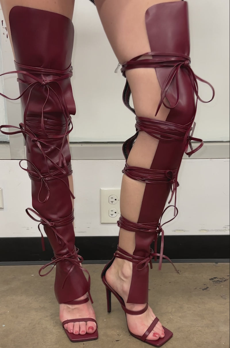 Crafted from sleek, supple faux leather in a rich burgundy hue, The AZALEA WANG Kristine Sandal is a gladiator-style shoe featuring an open square toe, a slim stiletto heel, two slender foot straps, and a dramatic, lace-up thigh-high silhouette. The unique design includes a structured upper panel that wraps the leg and long cords that tie all the way up for a customizable fit. Complete with a cushioned insole and a back zipper closure. Perfect for bold night-out looks or elevated festival styling.