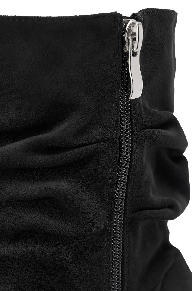 Minimalist black slouchy inverted wedge sandals designed for effortless, modern styling. This sleek black sandal features a faux suede fabric slouchy shaft, an almond open-toe, thin toe strap, inverted wedge heel, and a flat sole for all-day comfort. The side-zip closure design offers an easy, flexible fit while maintaining a clean, sculptural look. Perfect for warm-weather layering, these versatile boot sandals style seamlessly with oversized shirting, slip dresses, or tailored shorts for a chic, understated, fashion-forward ensemble.