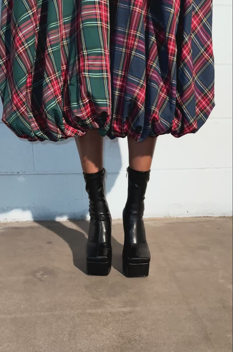 You mad? The AZALEA WANG Madder Black Platform Bootie is a faux leather style featuring a square-toe silhouette, a sturdy, towering platform sole and coordinating mega-chunky heel, an inner-ankle zipper closure, and a cushioned insole. Style with a plaid skirt and a leather blazer for an edgy ensemble.