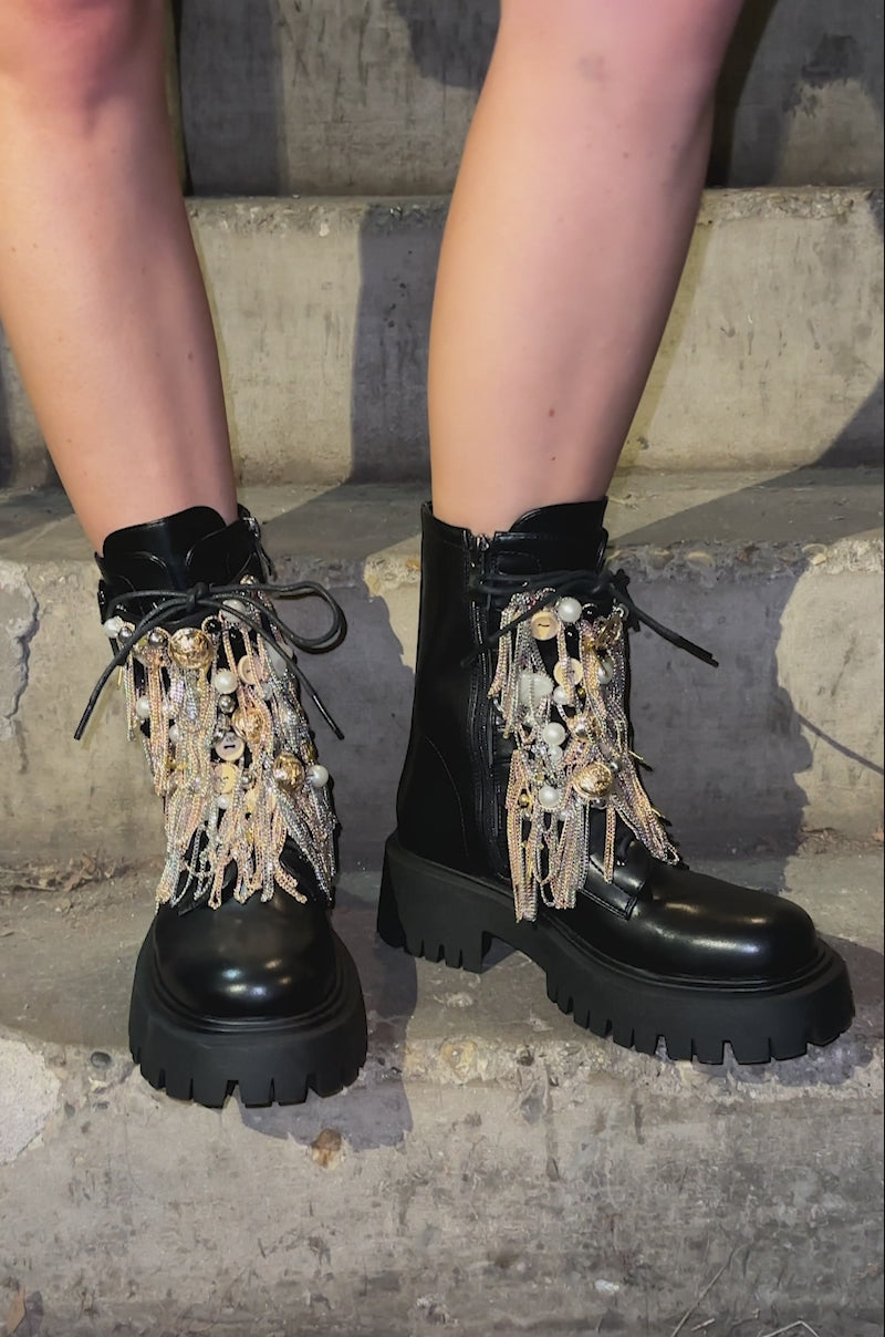 Bring edge and attitude to your shoe-drobe with the AZALEA WANG Megumi Black Metal Hardware Combat Bootie. Crafted from smooth faux leather, this daring ankle boot features a round toe, a chunky heel, a coordinating platform rubber lug sole, a lace-up front accented by multiple adjustable buckle straps adorned with two-tone stud accents, and a cascade of mixed-metal chain and charm embellishments for a maximalist, punk-glam look. Perfect for making a street-style statement.