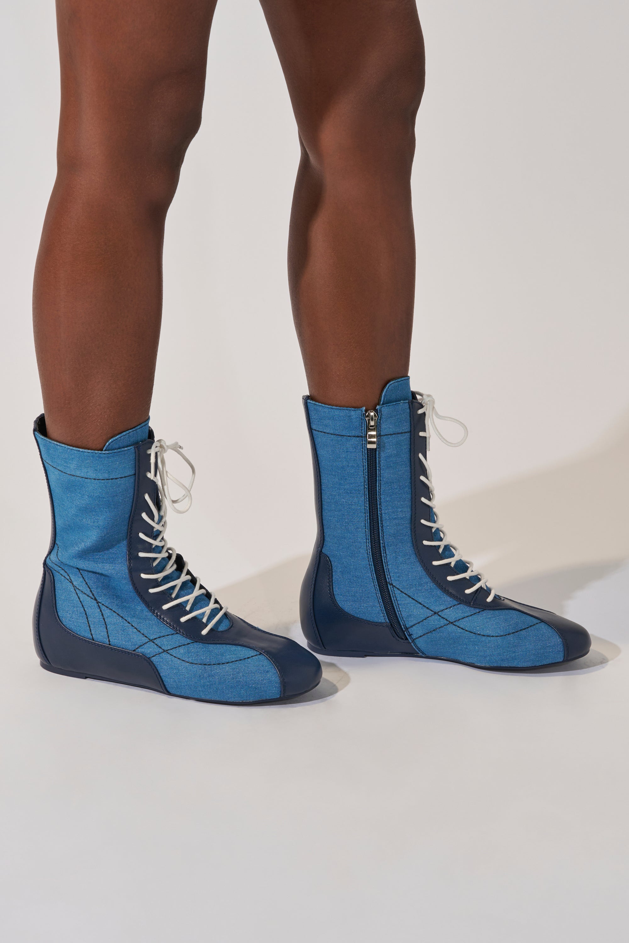 Speed meets style with the AZALEA WANG Passer Navy Flat Sneaker. This sporty-chic style is crafted from a medium-wash denim fabric and boasts a mid-calf shaft, an almond toe, a flat sole, navy blue faux leather detailing on the front shaft and back of the ankle, and a lace-up front closure. Complete with an inner ankle zip closure. Pair with baggy shorts or a tennis skirt for an elevated, off-duty finish.