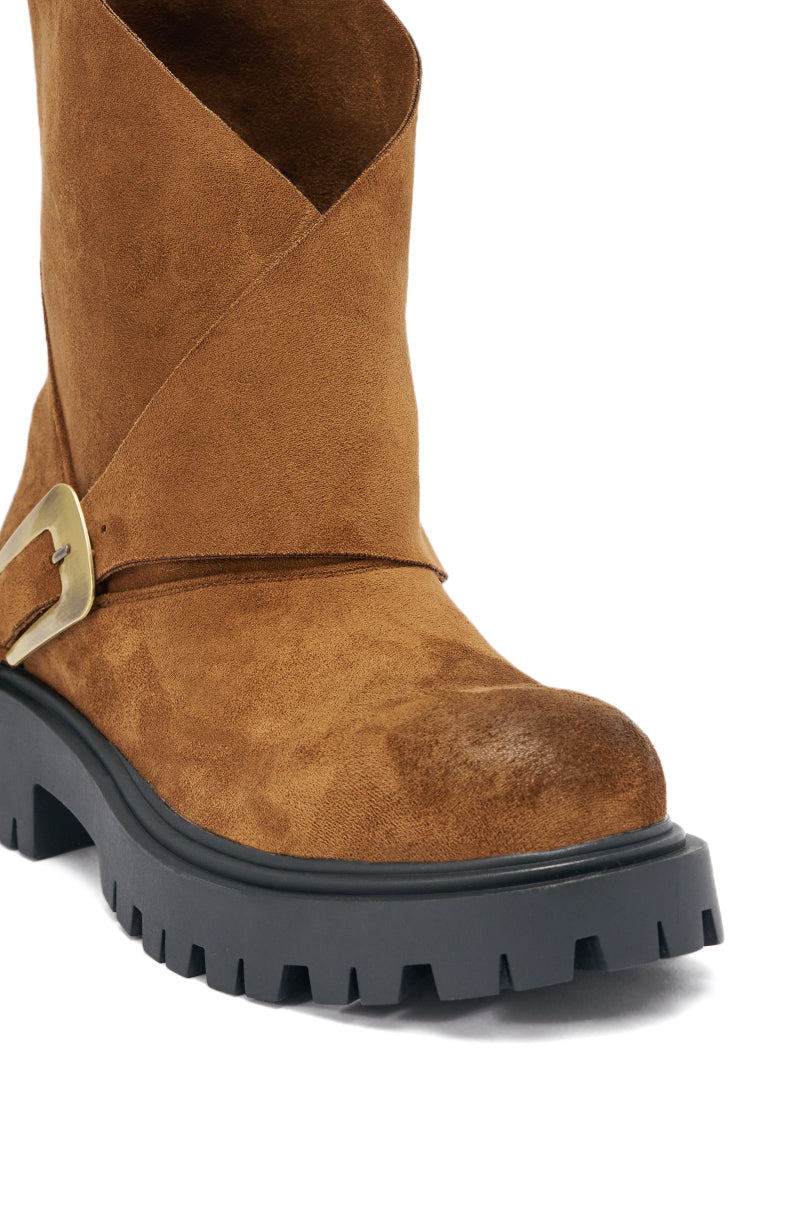 Ready to rock! The AZALEA WANG Phrixus Brown Chunky Short Shaft PU Boot features a chunky lug sole, round platform lug sole, and a mid calf asymmetrical fold-over shaft with a brushed-gold buckle. With a buttery, brown faux suede upper, this boot pairs perfectly with a slim jean and sweater for a cozy, cute look.