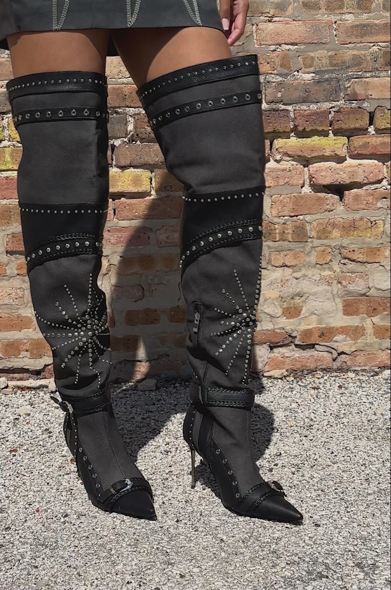 The AZALEA WANG Season Black Multi Embellished Stiletto Boot combines sleek design with bold details. This pointed-toe, thigh-high boot features mixed-texture black panels accented with gleaming studs and rhinestone starburst embellishments. Buckled straps and metallic trim add extra edge, while the slim stiletto heel delivers height and elegance. A striking shoe that elevates any outfit with drama and shine.