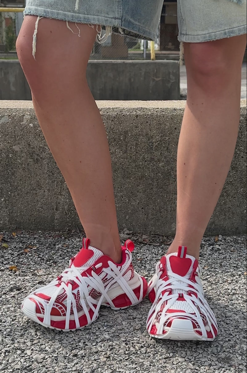 Put a ‘lil pep in your step with The AZALEA WANG Selie Red Flat Sneaker. These sporty shoes are crafted from a supple textile upper and feature a paneled design with various textiles including subtly metallic faux leather accents and netted mesh overlays. They also boast a bouncy, textured rubber sole, a supportive, chunky heel, and a no-tie lace-up vamp. The laces are sewn into a unique, web-like pattern and cannot be adjusted, making this a simple slip-on style. Complete with pull-on tongue and ankle tabs.